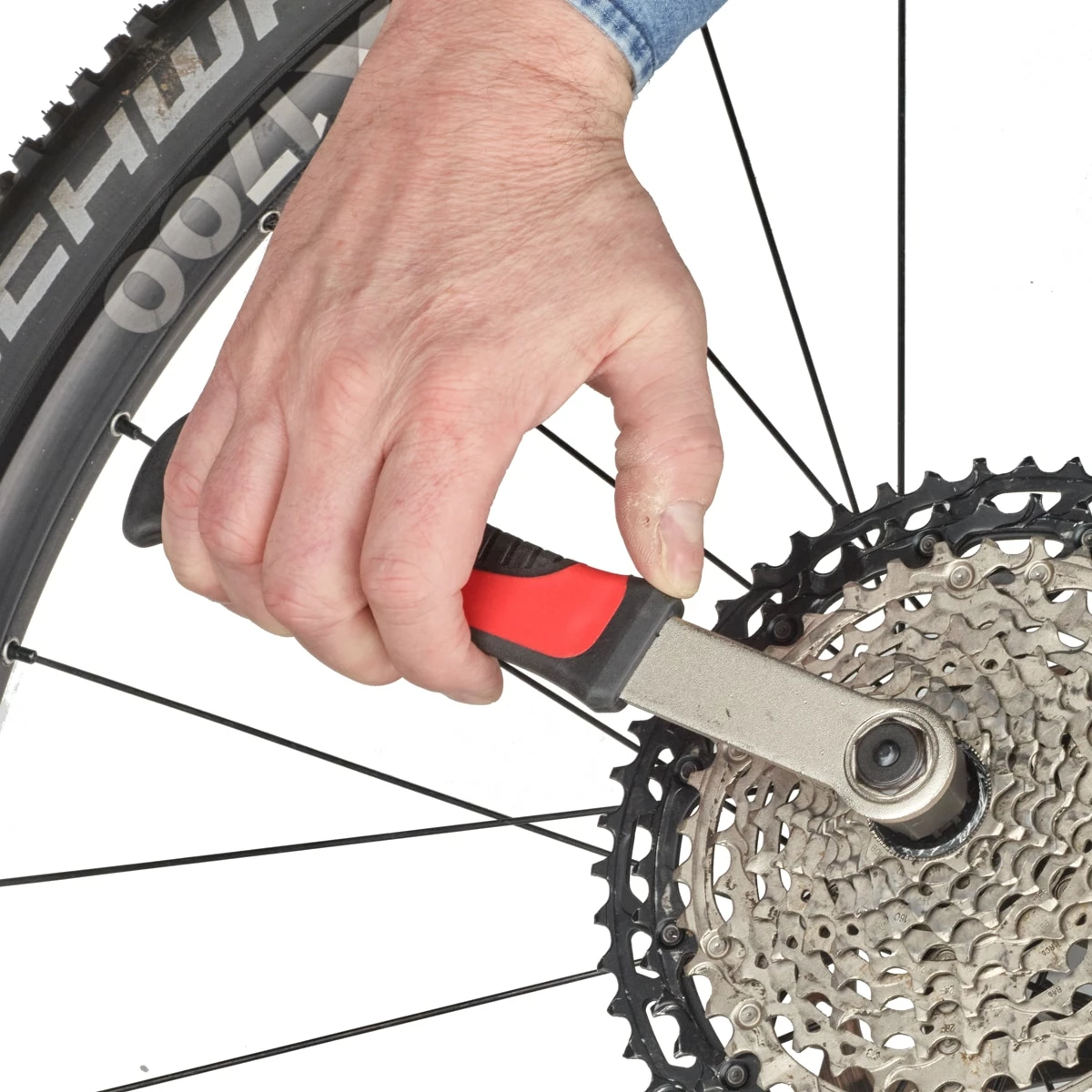 ROSE removal tool with padded handle and long guide pin. The pin into the hub axle to provide a secure hold.